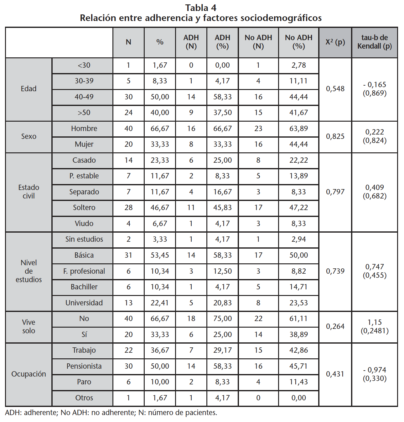 La adherencia está relacionada tanto con factores sociodemográficos como factores relacionados con el tratamiento, obteniéndose en este estudio mayor adherencia en pacientes de entre 40-50 años, varones, con mayor soporte familiar y con bajo nivel de estudios. También se observa mayor adherencia en pacientes con tratamientos de una sola toma diaria y en tratamiento de más de 10 años de duración.