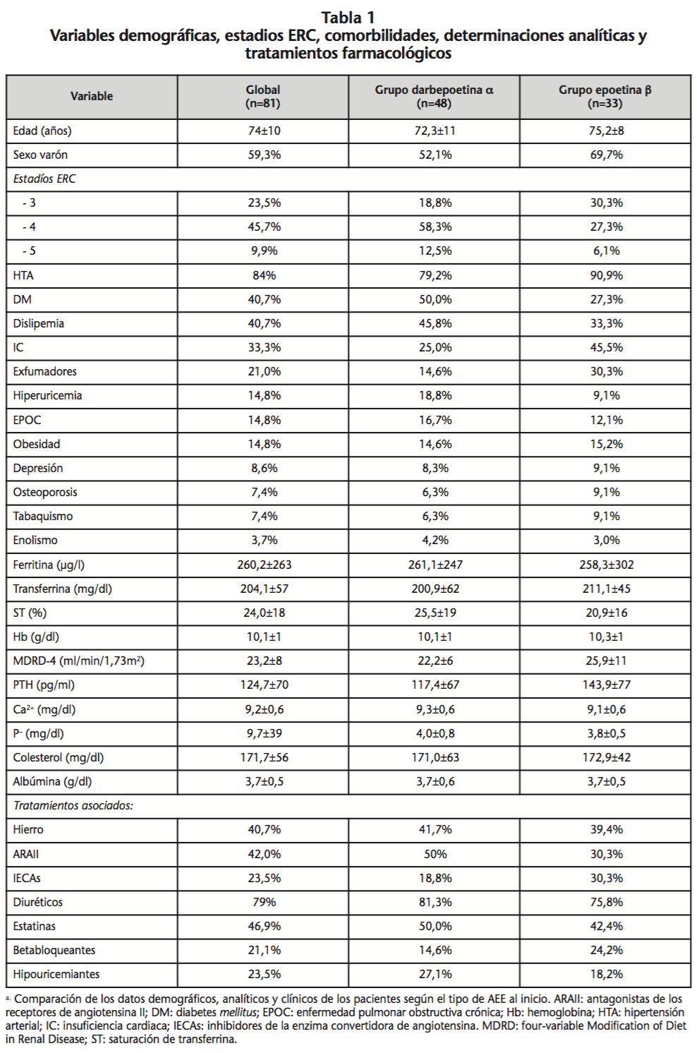De los 103 pacientes en prediálisis que iniciaron tratamiento con AEEs en 2013, se perdieron 22 pacientes: 15 por falta de datos y 7 por no ser posible completar el seguimiento (5 por éxitus y 2 por inicio de TRS). Finalmente, se incluyeron un total de 81 pacientes. El 59,3% varones, edad media de 74±10 años (rango 30-88 años). Los estadios de ERC fueron 3a (24,7%), 3b (5,0%), 4 (57,8%) y 5 (12,5%). El 59,2% de los pacientes recibieron darbepoetina α (dosis media basal: 20,55±10,30 µg/semana (5-50 µg)) y el 41,0% epoetina β (dosis media basal: 7.718,18±6.155,72 UI/semana (500-30.000 UI)).