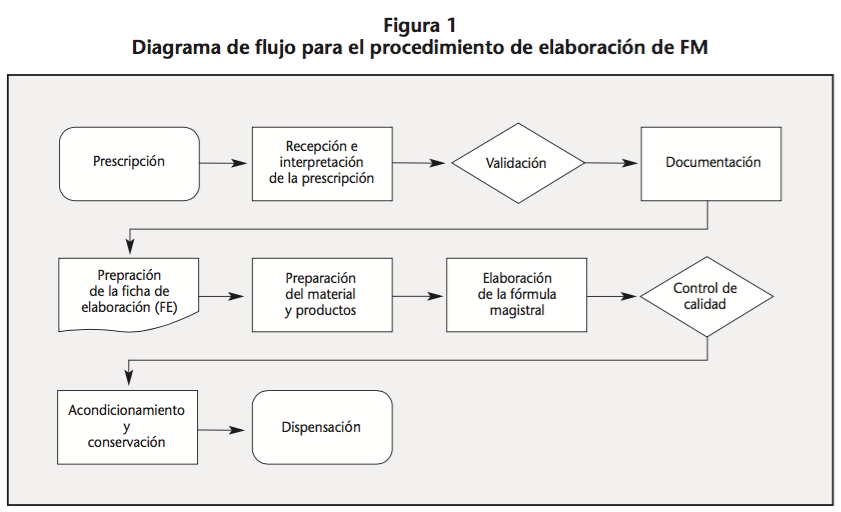 Se identificaron un total de 6 subprocesos para el procedimiento de elaboración de FM: recepción e interpretación de la prescripción, documentación, preparación de la ficha de elaboración (FE), preparación del material y productos, elaboración de la FM y acondicionamiento (envasado y etiquetado) y conservación (Figura 1).