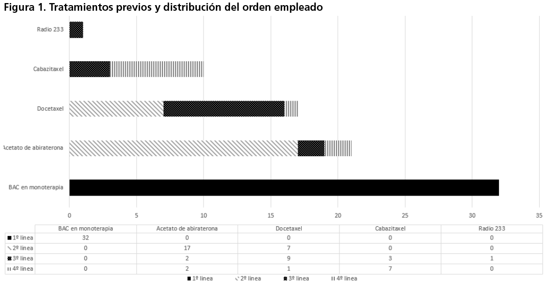 Acetato de abiraterona fue el tratamiento más empleado en segunda línea, mientras que la quimioterapia basada en taxanos fue empleado en un mayor porcentaje a partir de la tercera línea. Once pacientes (34,4%) secuenciaron el tratamiento con enzalutamida tras previo empleo de acetato de abiraterona, siendo los motivos las reacciones adversas relacionada con el tratamiento en 5 pacientes y clínicos en 6 casos. El tratamiento con enzalutamida se empleó previo uso a la quimioterapia en 12 pacientes.