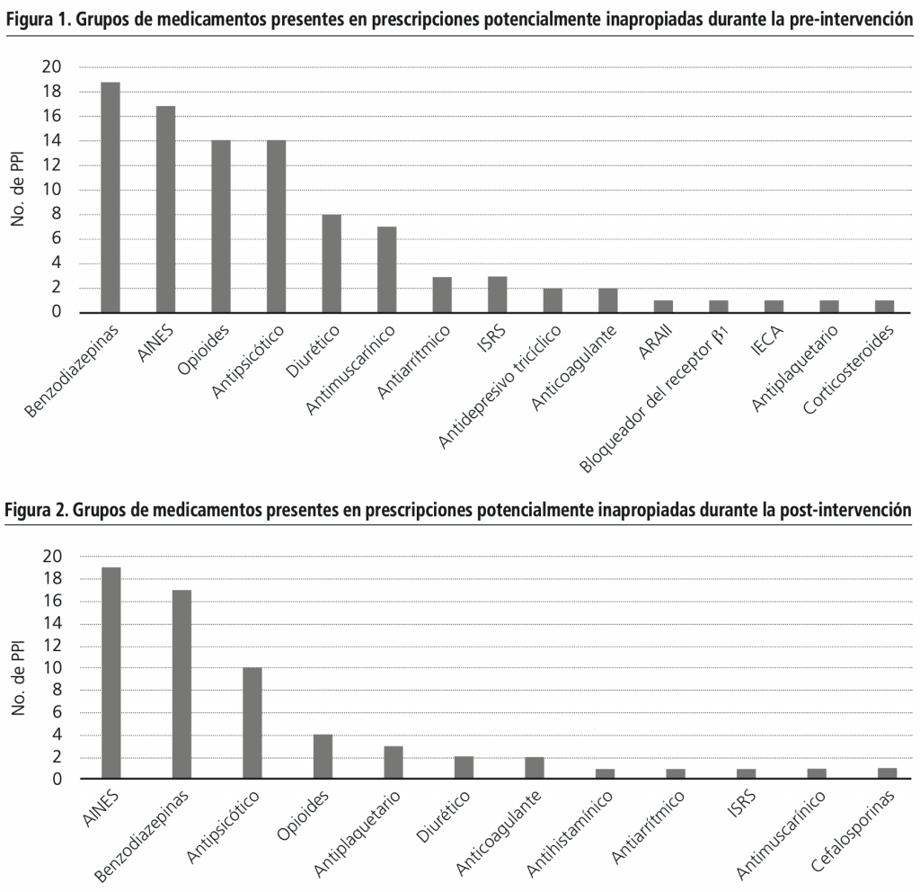 Dividida por grupos de medicamentos, el mayor grupo que presentó PPI fue el de AINES con 17 PPI pre-intervención y 19 PPI post-intervención, las benzodiacepinas con 19 PPI pre-intervención y 17 PPI post-intervención seguida de antipsicótico y opioides (figuras 1 y 2).
