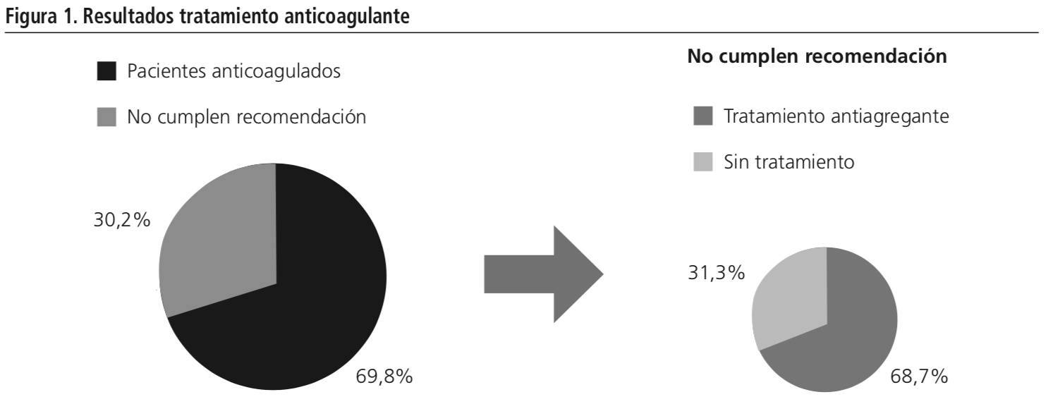 El análisis indicó que el 69,8% (n=37) de los pacientes recibía tratamiento anticoagulante, es decir, cumplían con la recomendación. De estos, el 75,7% tomaba anticoagulación convencional como acenocumarol o warfarina, el 18,9% tomaba nuevos anticoagulantes (apixaban y rivaroxaban) y el 5,4% estaba anticoagulado con heparinas de bajo peso molecular de manera crónica.