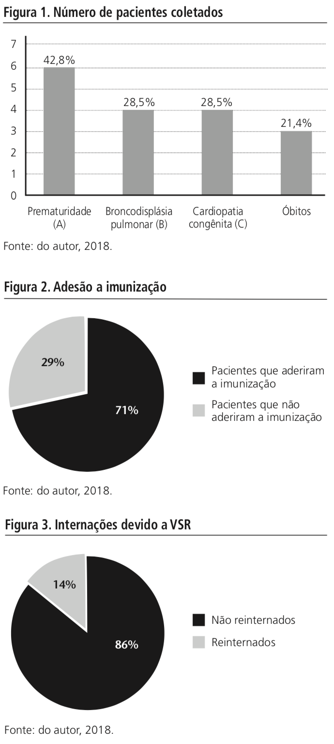 Foram incluídos no estudo 14 neonatos e jovens crianças, dos quais, 57,1% foram imunizados na UTI Neonatal, 21,4% na Clínica Pediátrica, 14,2% na UTI Pediátrica, e 7,1% na Clínica Cirúrgica Pediátrica. Considerando o diagnóstico 42,8% foram prematuros, 28,5% apresentavam displasia broncopulmonar e 28,5% cardiopatia congênita. Três óbitos (21,4%) foram registrados durante todo o acompanhamento, sendo que, estes óbitos não estão relacionados com o uso do palivizumabe ou à infecção por VSR, e sim devido à complexidade dos casos. (Conforme o Figura 1).