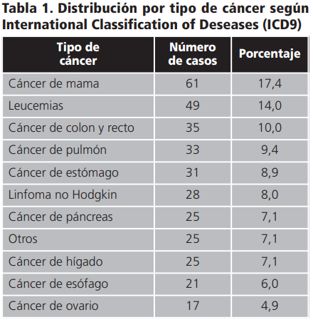 La media de días de hospitalización de todas las hospitalizaciones analizadas, por paciente fue: 48,2±23,4 (IC 95% 38,5-53,8) días, una media de 3,4 episodios de hospitalizaciones por paciente. Los días paciente analizados fueron 12.460. Los diagnósticos mayoritarios fueron: cáncer de mama: 61 (17,4%), leucemias 49 (14%), cáncer de colon y recto 35 (10%), cáncer de pulmón: 39 (9,4%), linfoma no Hodgkin: 28 (8%), cáncer de páncreas: 25 (7,1%), hepatocarcinoma: 25 (7,1%), se detallan en la tabla 1.