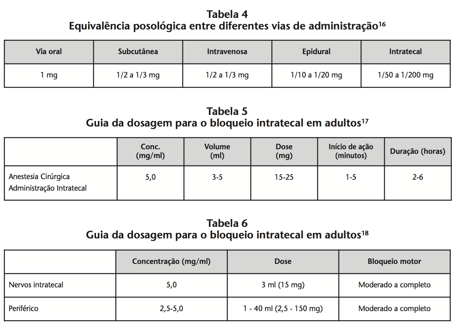 Por via intratecal, em adultos: 0,1 a 0,3 mg cada 12 a 24 horas16. Na tabela 4 está representada a equivalência posológica entre as diferentes vias de administração16.