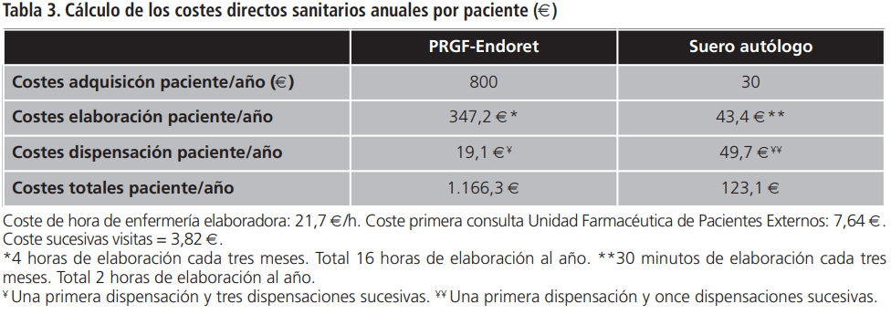 Teniendo en cuenta los gastos de adquisición del kit de PRGF-Endoret, el material necesario para la elaboración del suero autólogo y los costes de elaboración y de dispensación en la Unidad Farmacéutica de Pacientes Externos de ambas preparaciones se calculan los costes (Tabla 3). Los datos requeridos se obtuvieron del sistema de información económica del hospital. Se trata de cuatro elaboraciones anuales en ambos casos y cuatro dispensaciones anuales en el caso del PRGF-Endoret, mientras que el suero autólogo es de dispensación mensual ya que debe mantenerse en congelador a -20ºC. En total, sumando el gasto de adquisición, de elaboración y de dispensación los costes por paciente y año son 1.166,3 € para el Endoret y 123,1 € para el suero autólogo. En estos cálculos no se cuantifican los costes directos no sanitarios y los costes indirectos.