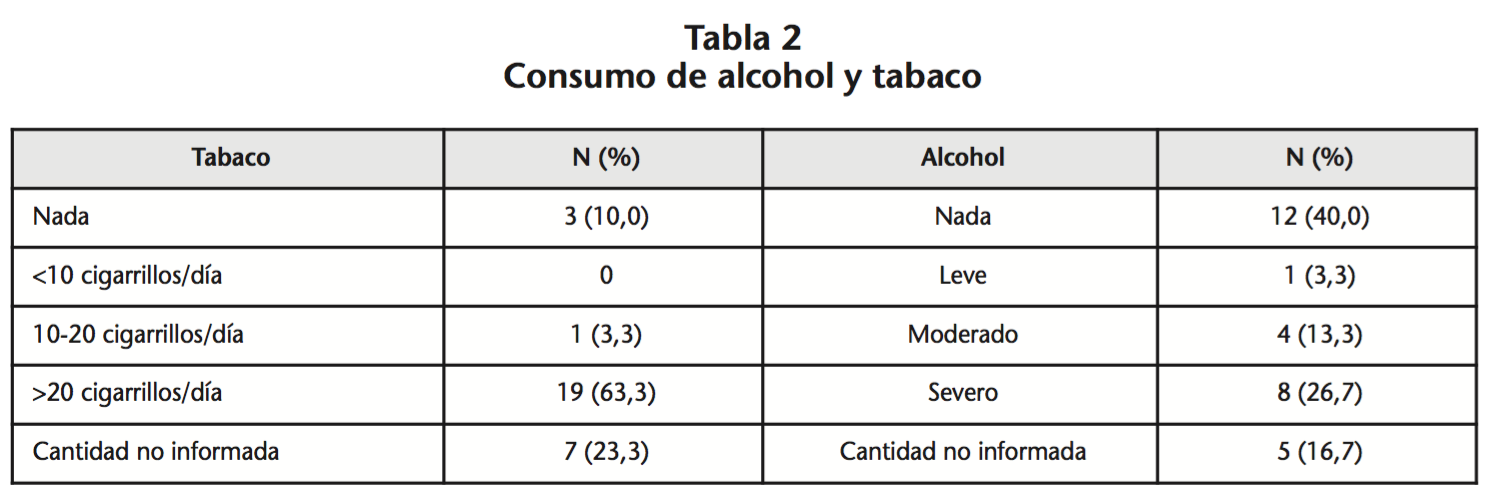 Durante el periodo de estudio, cumplieron los criterios de inclusión un total de 30 pacientes (25 hombres y 5 mujeres) con una mediana de edad de 68,5 años (rango 50-84). El 63,3% presentaba historia tabáquica de más de 20 cigarrillos/día y el 26,7% reconocieron ser bebedores severos (Tabla 2).